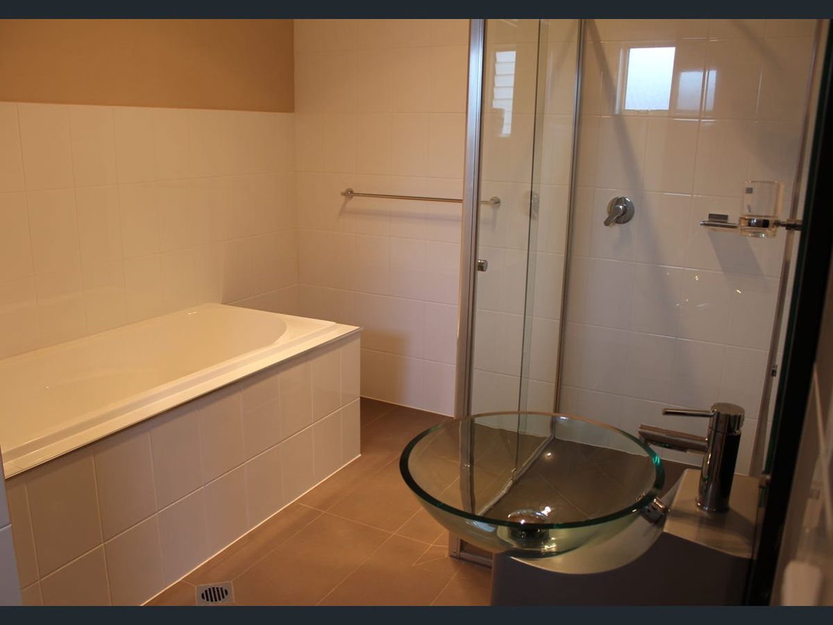Stylish bathroom includes bath and separate shower plus laundry.