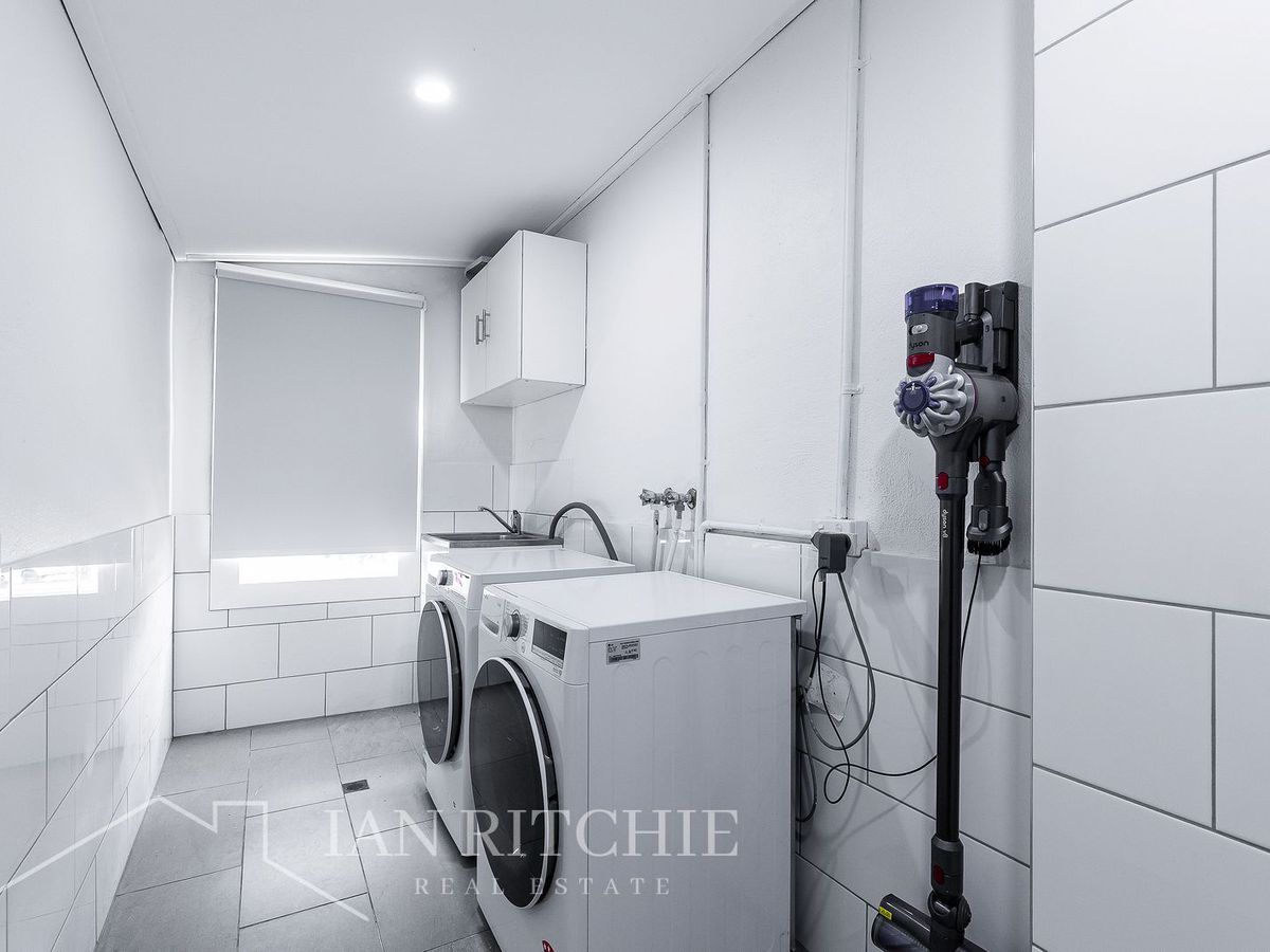 A brand-new bathroom and thoughtfully refurbished laundry enhance the home’s modern appeal, complete with washing machine, dryer, and a handheld Dyson vacuum.